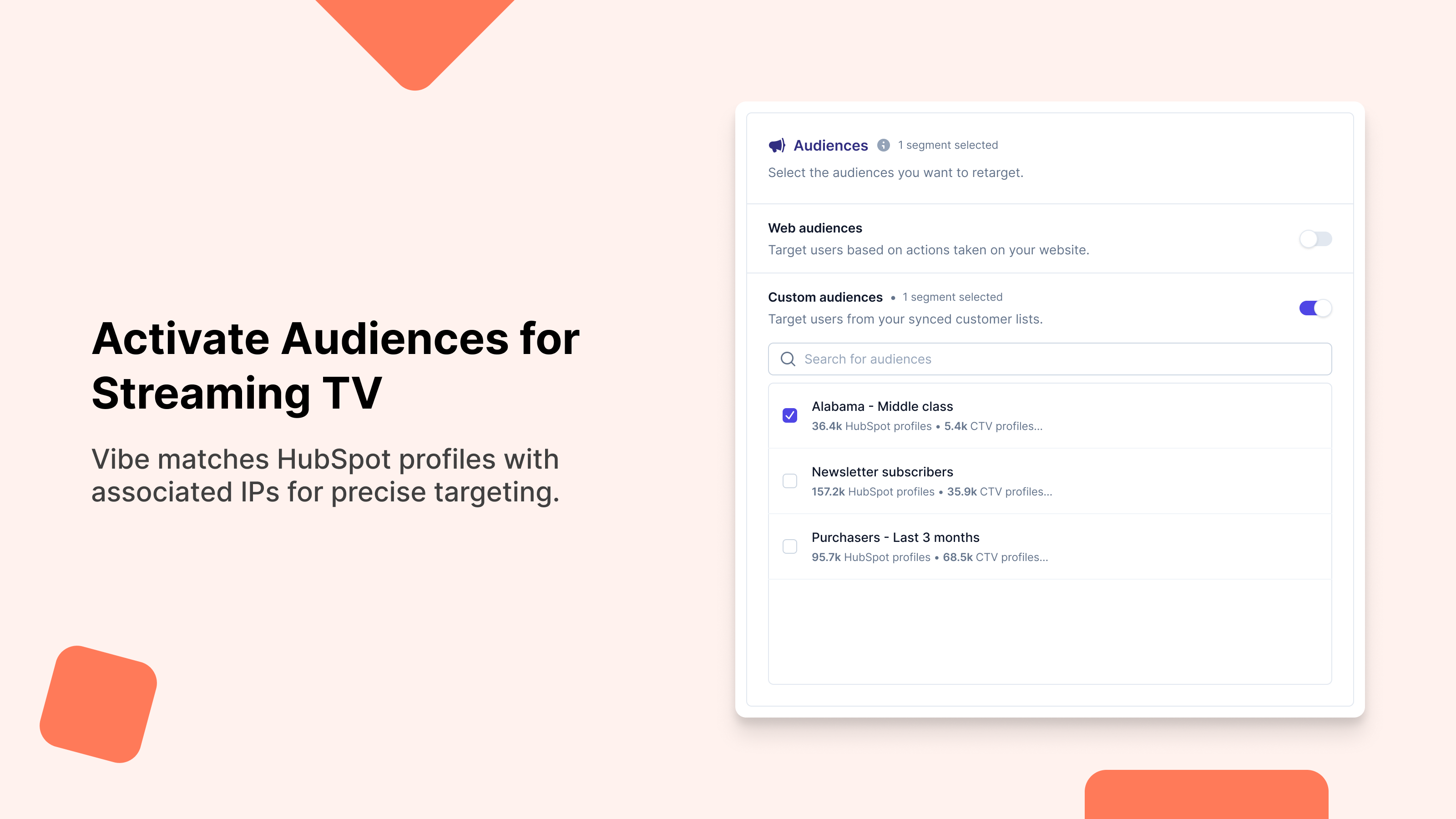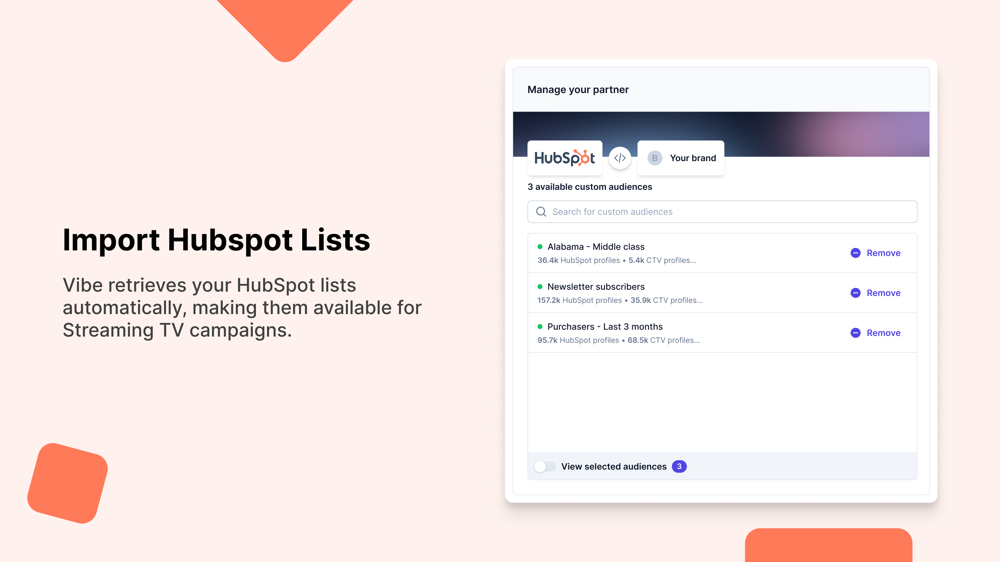 With this integration, you can import contact lists, segments, and lifecycle data from HubSpot to build precise Streaming TV audiences.